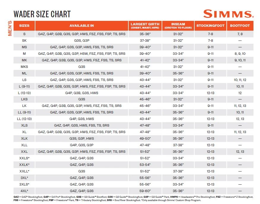 SIZE CHART for SIMMS WADERS